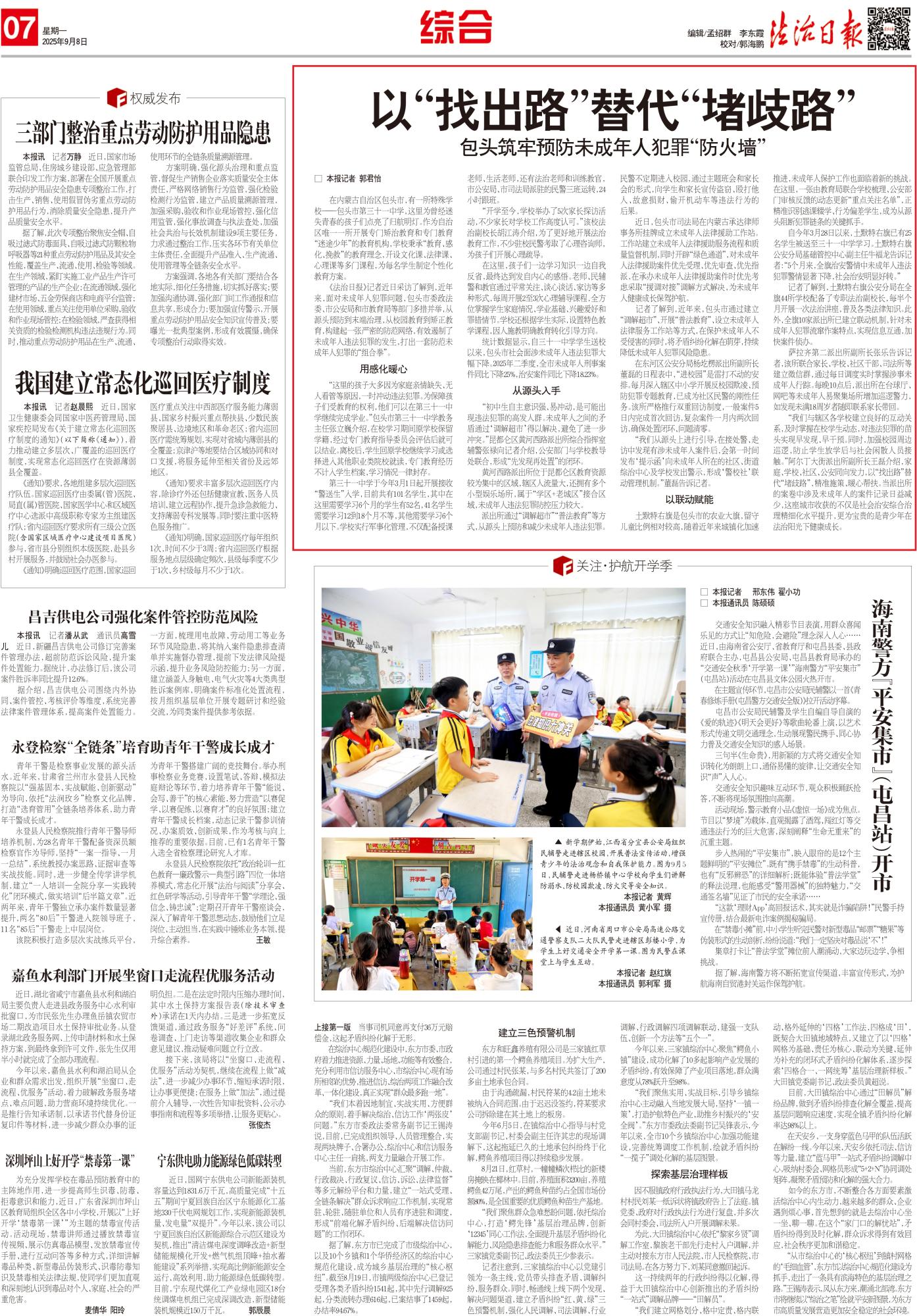 “我們與轄區(qū)各學(xué)校建立良好的互動(dòng)關(guān)系,及時(shí)掌握在校學(xué)生動(dòng)態(tài),對(duì)違法犯罪的苗頭實(shí)現(xiàn)早發(fā)現(xiàn)、早干預(yù)。同時(shí),加強(qiáng)校園周邊巡邏,防止學(xué)生放學(xué)后與社會(huì)閑散人員接觸?!卑柖〈蠼峙沙鏊彼L(zhǎng)王磊介紹,家庭、學(xué)校、社區(qū)、公安同向發(fā)力,以“找出路”替代“堵歧路”,精準(zhǔn)施策、暖心幫扶。當(dāng)派出所的案卷中涉及未成年人的案件記錄日益減少,這座城市收獲的不僅是社會(huì)治安綜合治理精細(xì)化水平提升,更為寶貴的是青少年在法治陽(yáng)光下健康成長(zhǎng)。(記者 郭君怡)