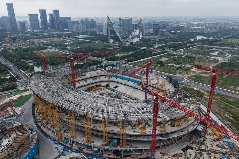 10月21日拍攝的余杭國際體育中心工程足球場(chǎng)項(xiàng)目(無人機(jī)照片)。據(jù)了解,足球場(chǎng)鋼結(jié)構(gòu)設(shè)計(jì)總重量達(dá)42000噸,其中屋蓋鋼結(jié)構(gòu)占18000噸。