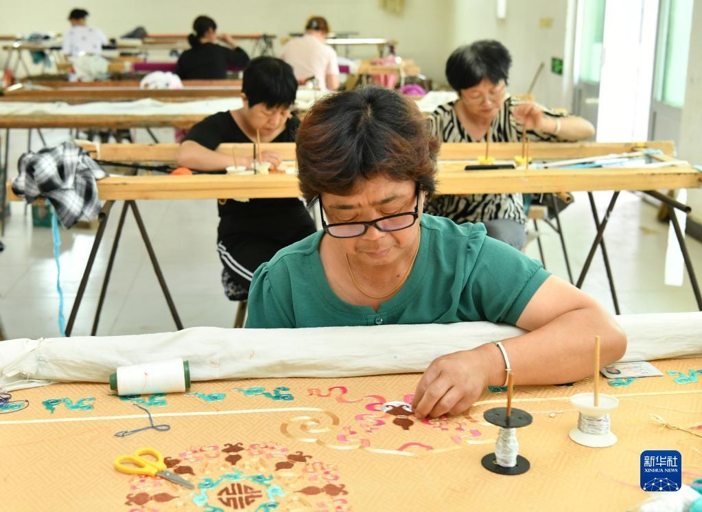 6月13日,河北省肅寧縣邵莊鄉(xiāng)東高家口村一家戲曲服裝廠的工人在繡制戲曲服裝。