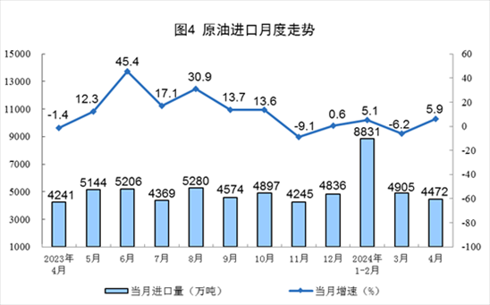 1—4月份,規(guī)上工業(yè)原油產(chǎn)量7095萬(wàn)噸,同比增長(zhǎng)2.1%。進(jìn)口原油18207萬(wàn)噸,同比增長(zhǎng)2.0%。