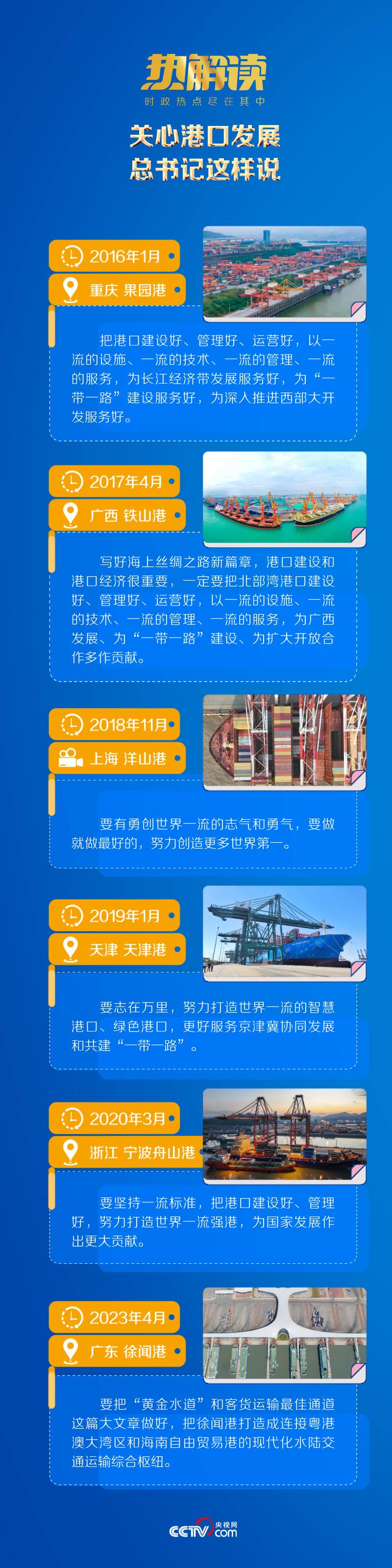 從內(nèi)河航運的黃金水道到國際航運的港通四海,總書記多次在考察行程中關注我國沿海沿江港口建設,精心謀劃推進世界一流強港建設工作。