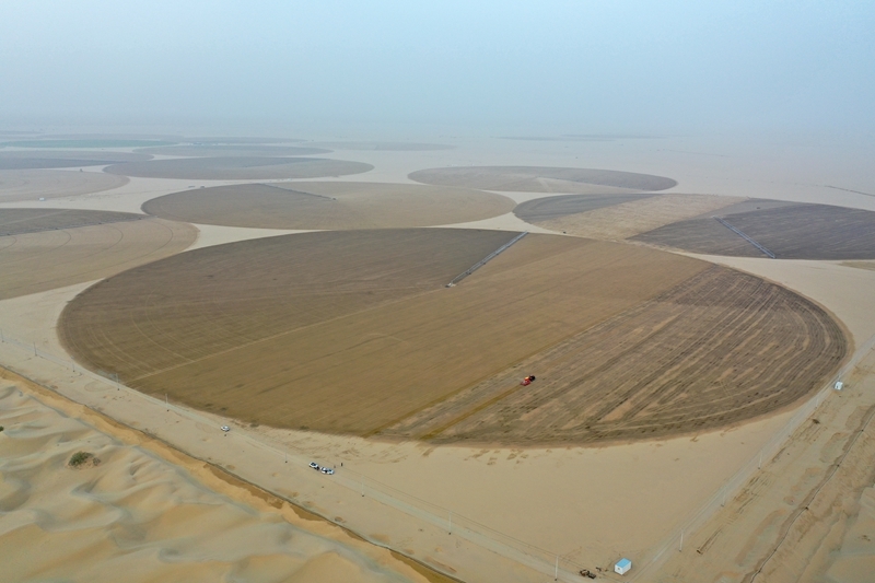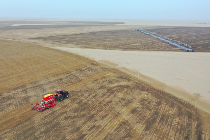 在新疆和田地區(qū)策勒縣4萬畝苜蓿種植基地,農機手駕駛機械在播種苜蓿(9月9日攝,無人機照片)。
