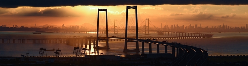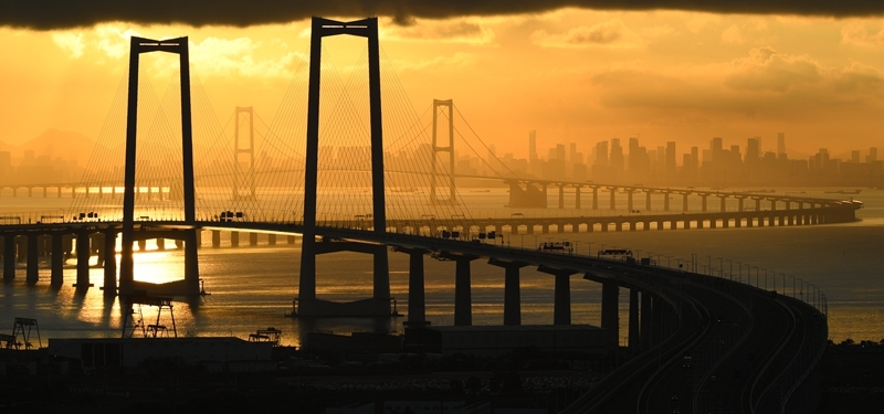 9月14日拍攝的沐浴在晨曦之中的深中通道與遠(yuǎn)處的深圳市區(qū)。