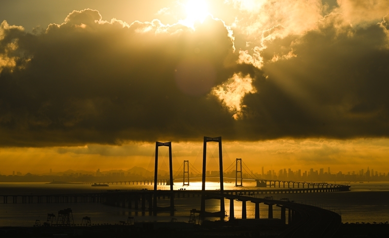 珠江口伶仃洋上,深中通道沐浴在晨曦之中,長虹臥波、美不勝收。
