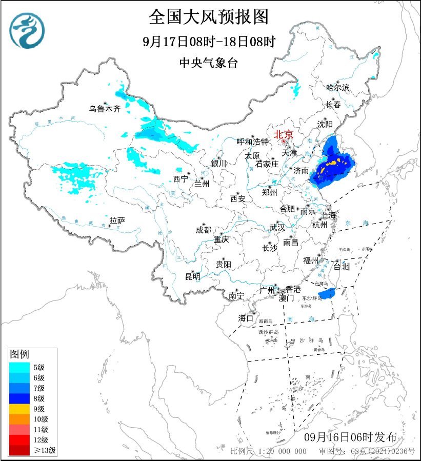 預計,9月16日8時至17日8時,新疆東部及南疆盆地、甘肅河西、青海北部、內(nèi)蒙古西部和中東部、東北地區(qū)西部、山東半島等地部分地區(qū)有5級、陣風7級的大風,其中,內(nèi)蒙古東北部的部分地區(qū)風力可達7級、陣風9級;渤海、渤海海峽、黃海北部和中西部海域?qū)⒂?~8級、陣風9級的大風,其中黃海中西部的部分海域風力可達9~10級、陣風11級。