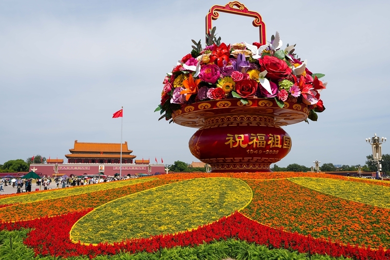 9月25日,2025年“祝福祖國”巨型花籃正式完工,亮相天安門廣場與市民共度佳節(jié)。今年“祝福祖國”花壇以喜慶的花籃為主景,花壇頂高18米,籃體高16米,籃盤直徑12米。籃體南側書寫“祝福祖國”“1949-2025”字樣,籃體北側書寫“歡度國慶”“1949-2025”字樣。籃內(nèi)選取了美好寓意的花卉,其中荷花寓意“和和美美”、橄欖枝寓意“榮耀和平”等,還結合和平鴿元素,體現(xiàn)“和平發(fā)展、欣欣向榮”。