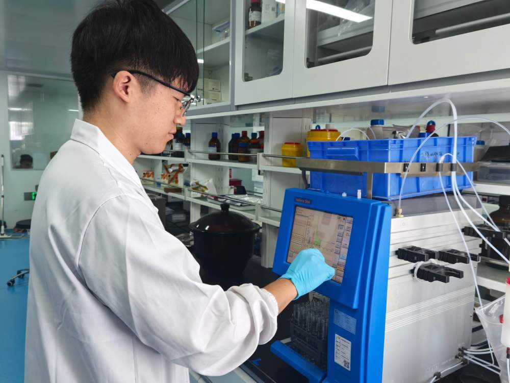 合源生物科技(天津)有限公司工作人員在生產(chǎn)基地的檢測室進行檢測。新華社記者 趙子碩 攝