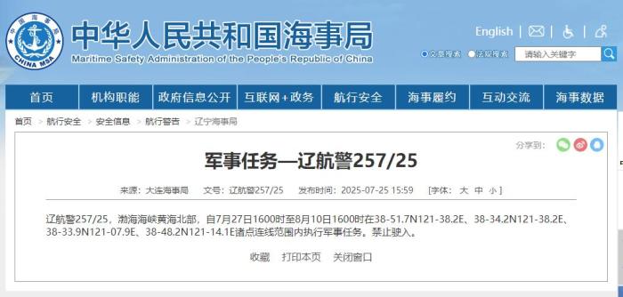據(jù)中國海事局網(wǎng)站消息,大連海事局發(fā)布航行警告,7月27日16時至8月10日16時,渤海海峽黃海北部部分海域執(zhí)行軍事任務,禁止駛入。