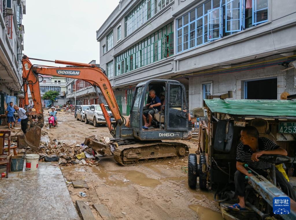 8月6日,在廣東清遠佛岡縣石角鎮(zhèn)黃花村,工作人員用挖掘機將村民清理出的淤泥與雜物轉(zhuǎn)移到拖拉機上統(tǒng)一清運。