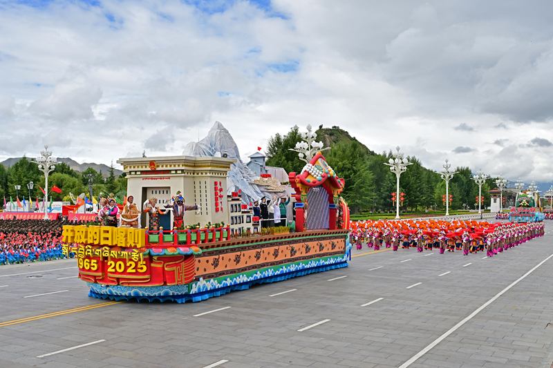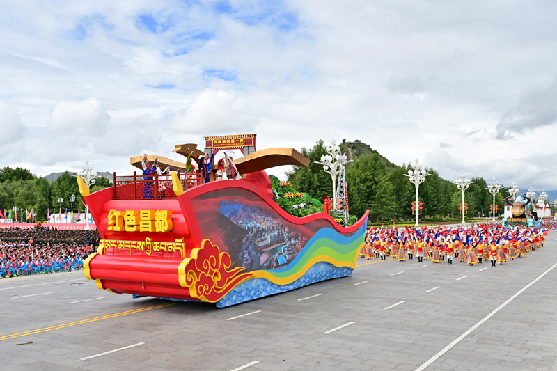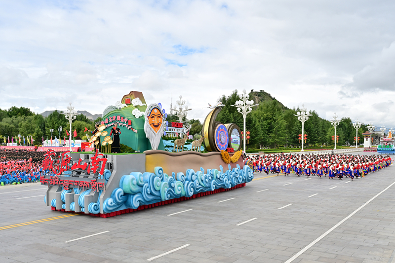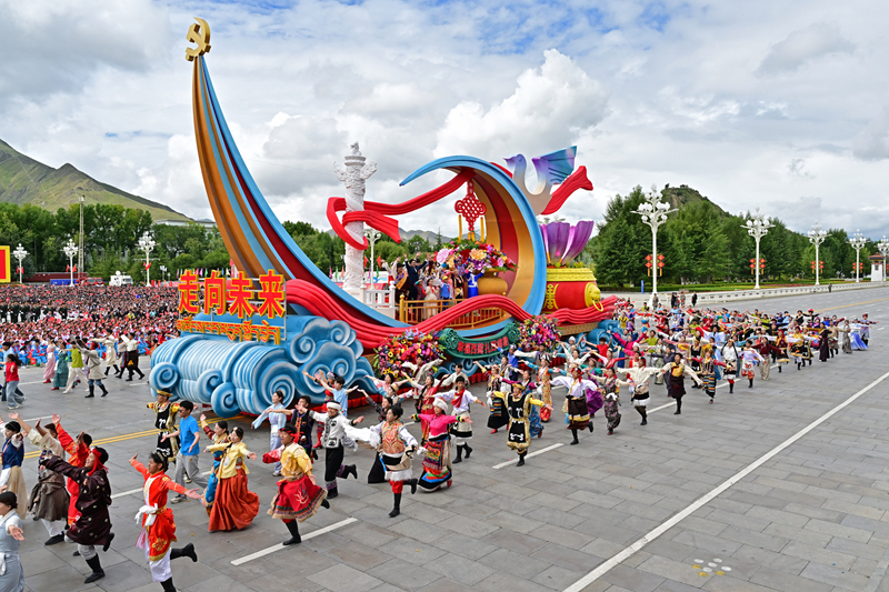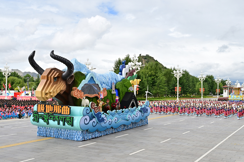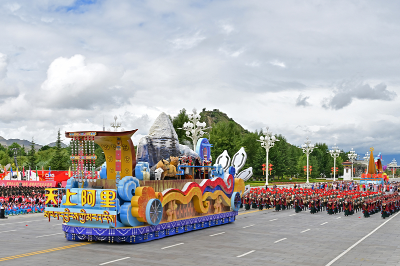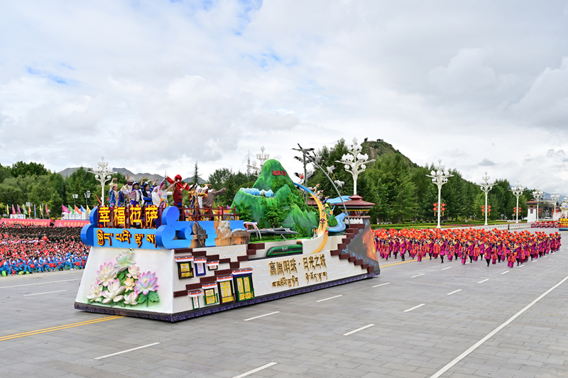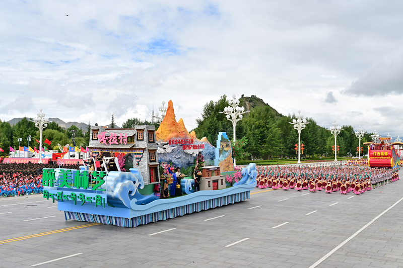 8月21日上午,西藏各族各界干部群眾約2萬(wàn)人歡聚拉薩市布達(dá)拉宮廣場(chǎng),熱烈慶祝西藏自治區(qū)成立60周年。這是游行的彩車(chē)通過(guò)布達(dá)拉宮廣場(chǎng)。