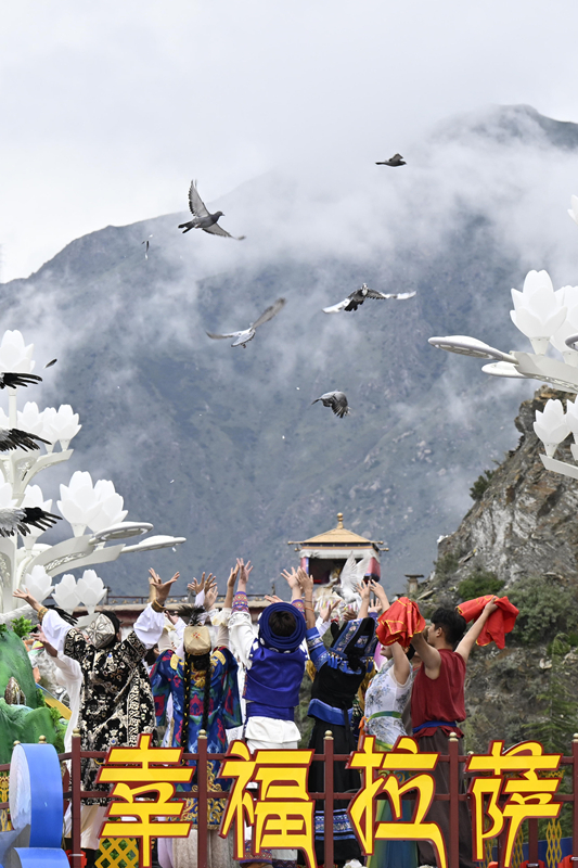 8月21日上午,西藏各族各界干部群眾約2萬(wàn)人歡聚拉薩市布達(dá)拉宮廣場(chǎng),熱烈慶祝西藏自治區(qū)成立60周年。這是彩車(chē)上的演員通過(guò)布達(dá)拉宮廣場(chǎng)時(shí)放飛鴿子。