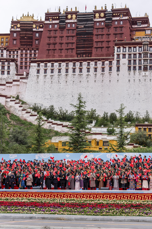 8月21日上午,西藏各族各界干部群眾約2萬(wàn)人歡聚拉薩市布達(dá)拉宮廣場(chǎng),熱烈慶祝西藏自治區(qū)成立60周年。這是游行隊(duì)伍通過(guò)布達(dá)拉宮廣場(chǎng)。