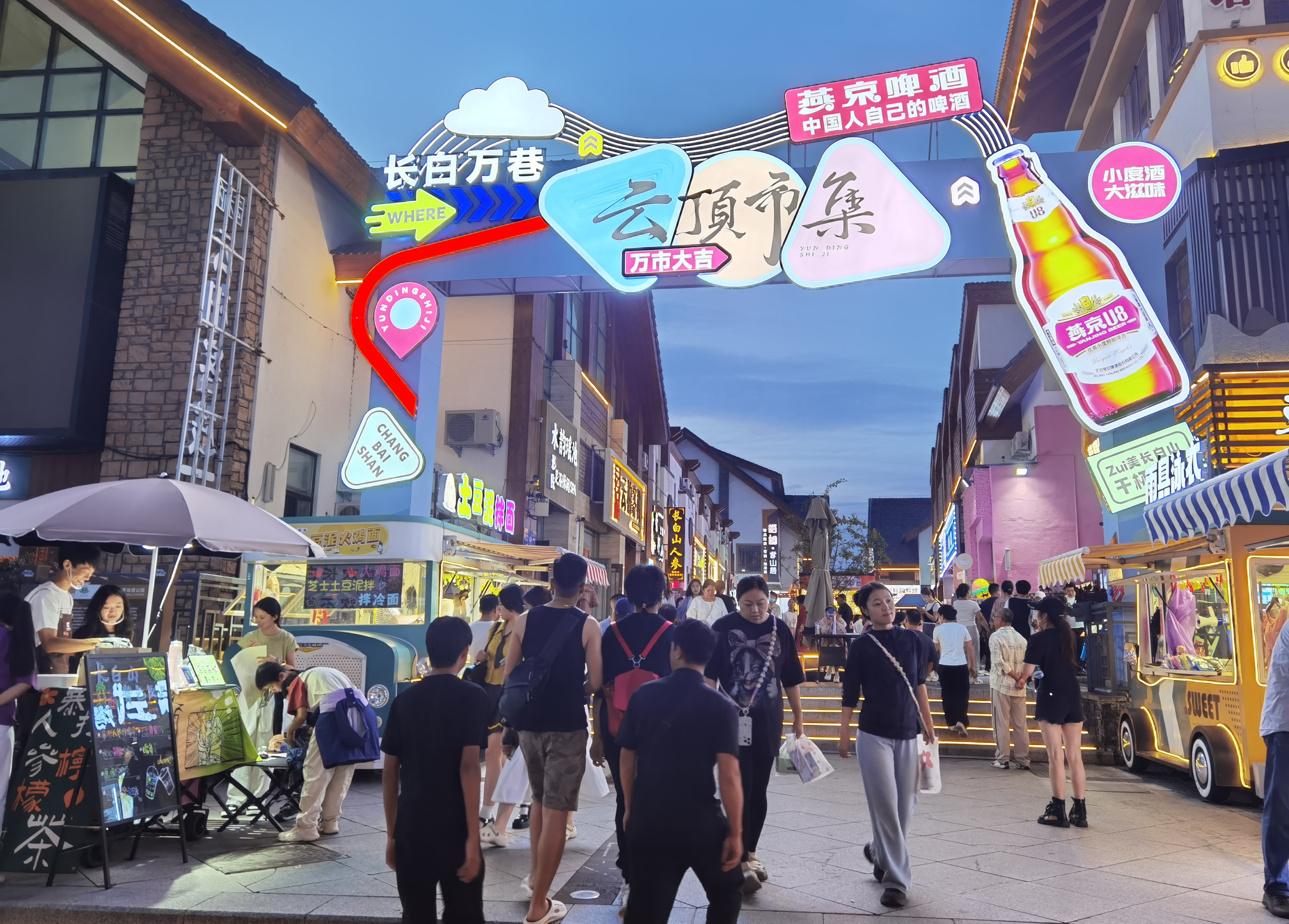 夜幕初降,云頂市集人潮涌動(dòng),樂(lè)隊(duì)彈唱與林間松風(fēng)交織;雪絨花音樂(lè)生活館里,燈光璀璨,民謠悠遠(yuǎn);美人松愛情森林里,漫步其間的情侶與家庭,寫下屬于他們的浪漫記憶。更令人驚艷的,是今夏盛大開街的恩都里(滿語(yǔ)enduri意為“神靈”)休閑度假商旅社區(qū)。