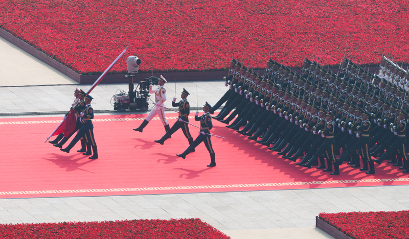 9月3日,紀(jì)念中國人民抗日戰(zhàn)爭暨世界反法西斯戰(zhàn)爭勝利80周年大會在北京隆重舉行。這是走向旗桿基座的國旗護衛(wèi)隊。