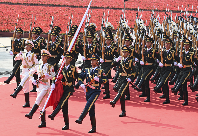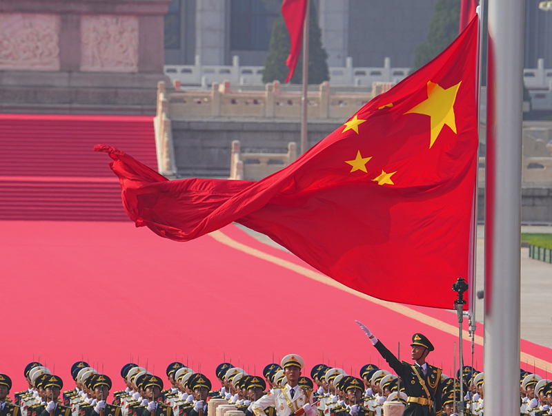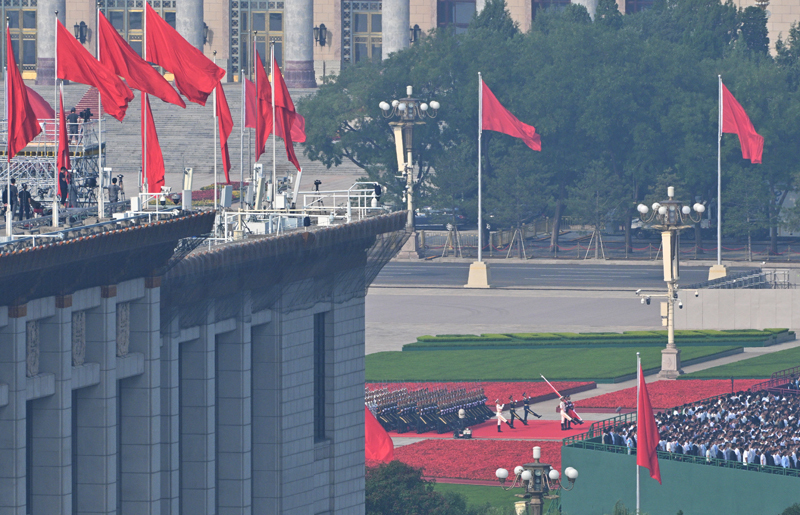 9月3日,紀念中國人民抗日戰(zhàn)爭暨世界反法西斯戰(zhàn)爭勝利80周年大會在北京隆重舉行。這是國旗護衛(wèi)隊從人民英雄紀念碑基座出發(fā),走向旗桿基座。