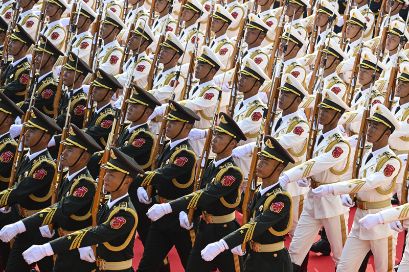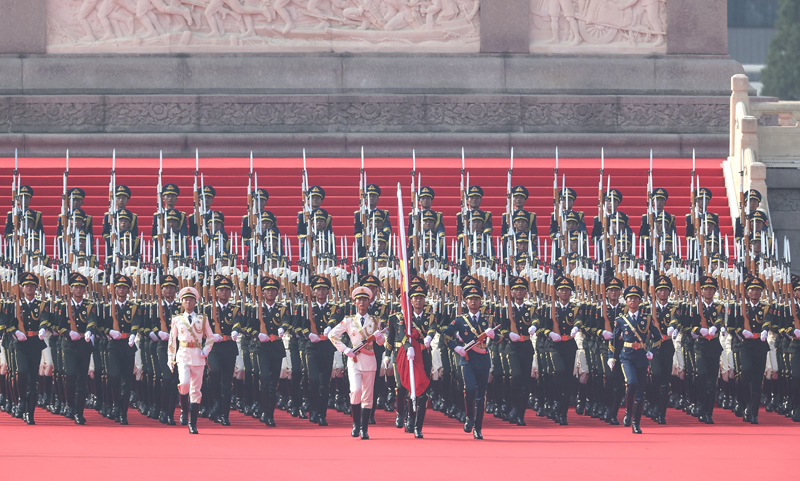 9月3日,紀念中國人民抗日戰(zhàn)爭暨世界反法西斯戰(zhàn)爭勝利80周年大會在北京隆重舉行。這是國旗護衛(wèi)隊官兵護衛(wèi)著五星紅旗行進。