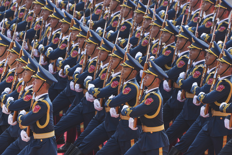 9月3日,紀念中國人民抗日戰(zhàn)爭暨世界反法西斯戰(zhàn)爭勝利80周年大會在北京隆重舉行。這是國旗護衛(wèi)隊在行進中。