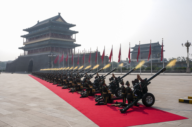 9月3日,紀念中國人民抗日戰(zhàn)爭暨世界反法西斯戰(zhàn)爭勝利80周年大會在北京隆重舉行。這是禮炮在天安門廣場鳴響。