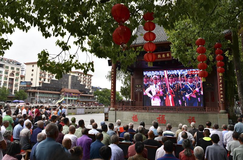 9月3日,在福建省三明市寧化縣,退伍軍人和群眾一起觀看紀(jì)念中國(guó)人民抗日戰(zhàn)爭(zhēng)暨世界反法西斯戰(zhàn)爭(zhēng)勝利80周年大會(huì)直播。