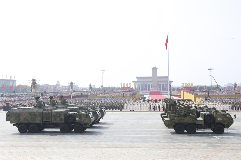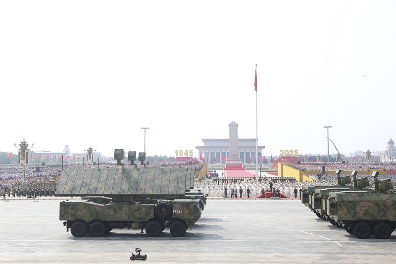 9月3日,紀(jì)念中國人民抗日戰(zhàn)爭暨世界反法西斯戰(zhàn)爭勝利80周年大會在北京隆重舉行。這是艦載防空武器方隊(duì)接受檢閱。