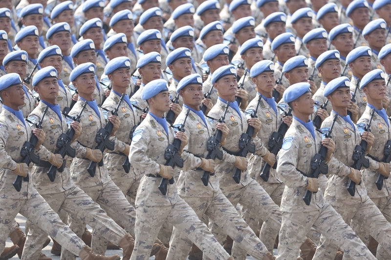 9月3日,紀(jì)念中國人民抗日戰(zhàn)爭暨世界反法西斯戰(zhàn)爭勝利80周年大會在北京隆重舉行。這是維和部隊(duì)方隊(duì)接受檢閱。