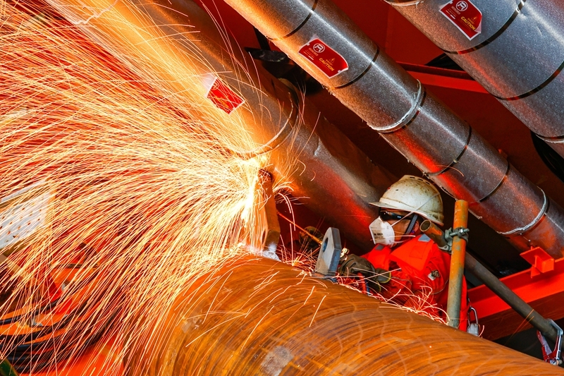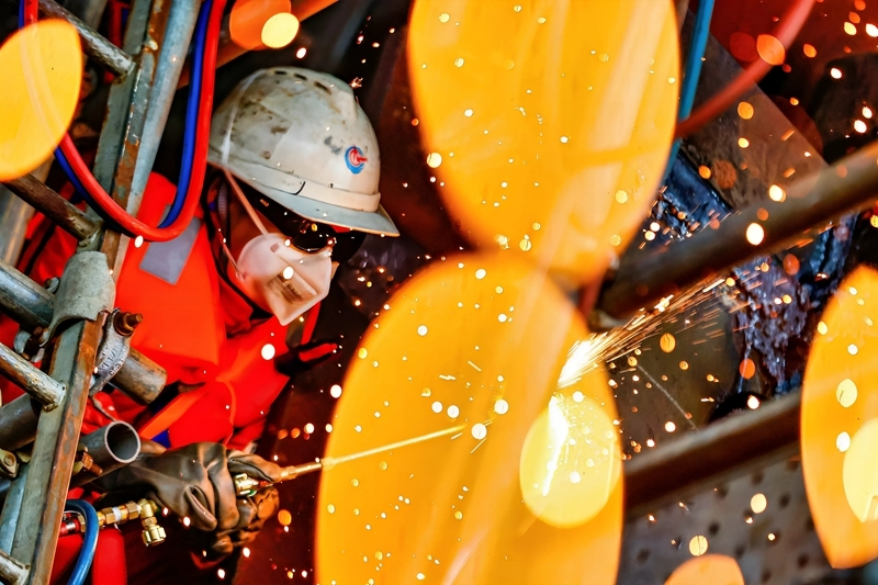 9月8日,工人在墾利6-1油田10-1北區(qū)塊Ⅱ期開發(fā)項(xiàng)目油氣平臺(tái)安裝作業(yè)現(xiàn)場(chǎng)進(jìn)行切割作業(yè)。
