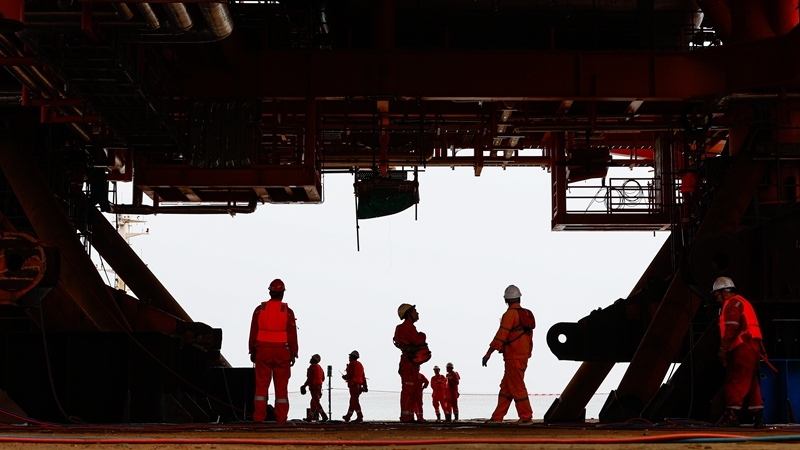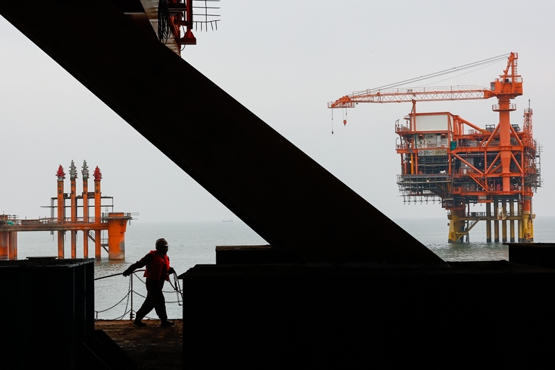9月8日,工人在墾利6-1油田10-1北區(qū)塊Ⅱ期開發(fā)項(xiàng)目油氣平臺(tái)安裝作業(yè)現(xiàn)場(chǎng)施工。