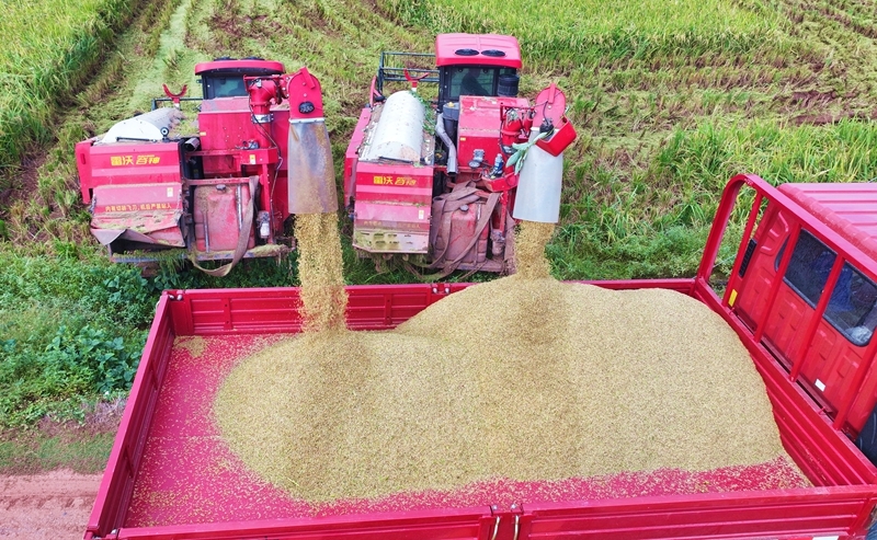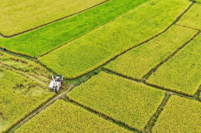 10月17日,在湖南省永州市道縣梅花鎮(zhèn)梅花村,水稻種植大戶采用大型機(jī)械收獲稻谷(無人機(jī)照片)。