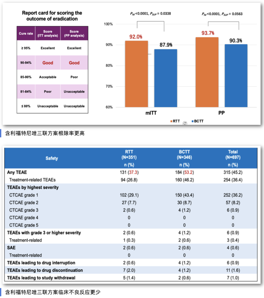 這項在中國開展的多中心、隨機、雙盲、陽性對照研究,納入700例幽門螺桿菌感染初治患者。宋志強介紹,利福特尼唑是我國自主研發(fā)的全球首創(chuàng)新型分子實體藥物,專門針對幽門螺桿菌感染研發(fā)。相關基礎和臨床研究結果均顯示,幽門螺桿菌對該藥物普遍敏感,最小抑菌濃度低,有效克服幽門螺桿菌高耐藥問題,而且表現出良好的安全性。