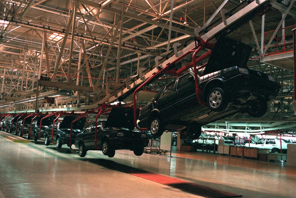 圖為1997年拍攝的一汽-大眾總裝車間捷達轎車生產(chǎn)線,這是當時國內(nèi)最先采用空中懸鏈式裝配的流水線。
