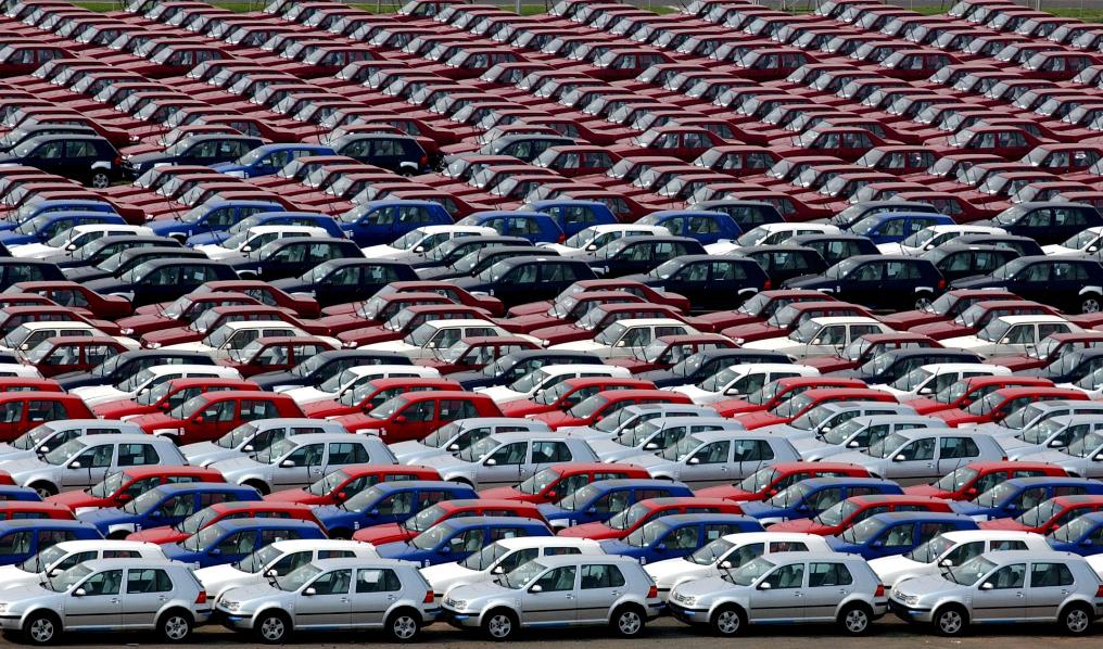2003年7月13日拍攝的一汽-大眾廠區(qū)內(nèi)等待發(fā)貨的轎車。
