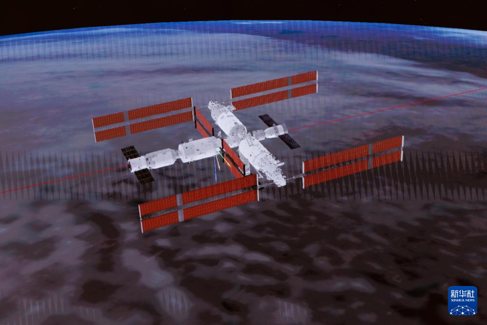 4月24日在北京航天飛行控制中心拍攝的神舟二十號(hào)載人飛船成功對(duì)接空間站天和核心艙的模擬畫(huà)面。新華社記者 金立旺 攝