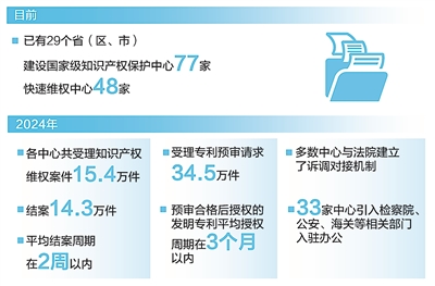 保護知識產權就是保護創(chuàng)新。中共中央、國務院印發(fā)的《知識產權強國建設綱要(2021—2035年)》提出,“建立完善知識產權仲裁、調解、公證、鑒定和維權援助體系”。目前,已有29個?。▍^(qū)、市)建設國家級知識產權保護中心77家、快速維權中心48家。