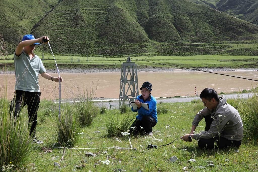 7月22日,長江科學(xué)院水土保持研究所的科考隊(duì)員在通天河直門達(dá)河段進(jìn)行植被樣方調(diào)查。新華社記者劉詩平攝