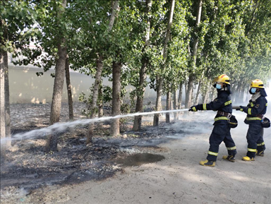 圖三:2023年5月2日,河南省濟(jì)源市消防救援支隊(duì)濟(jì)瀆路特勤站在處置飛絮引發(fā)的火情(來源:新華社)
