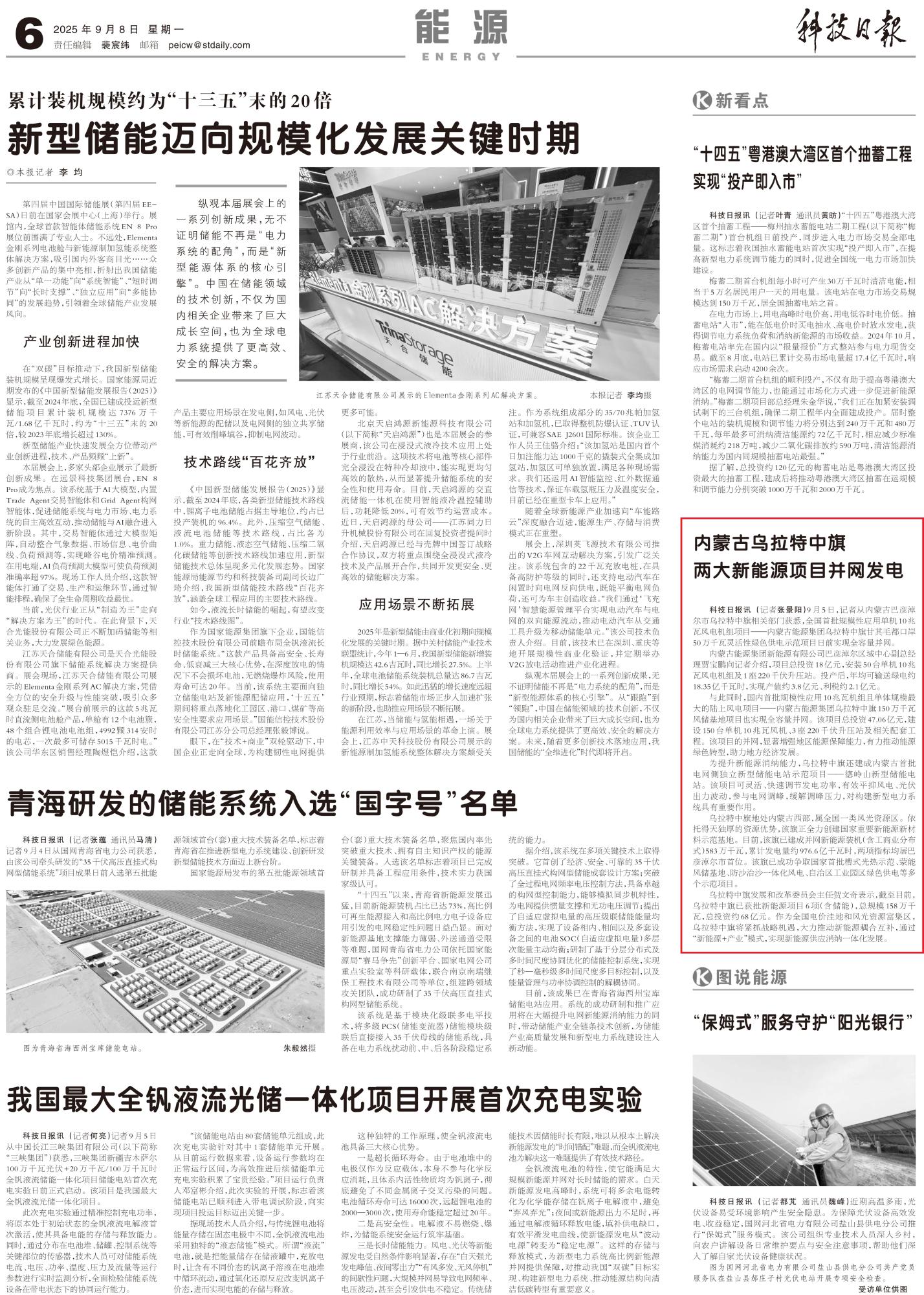 2025年9月8日,《科技日報》第6版整版刊發(fā)題為《內蒙古烏拉特中旗兩大新能源項目并網(wǎng)發(fā)電》的文章,報道了記者從內蒙古巴彥淖爾市烏拉特中旗相關部門獲悉,全國首批規(guī)模性應用單機10兆瓦風電機組項目——內蒙古能源集團烏拉特中旗甘其毛都口岸50萬千瓦靈活性綠色供電示范項目日前實現(xiàn)全容量并網(wǎng)。