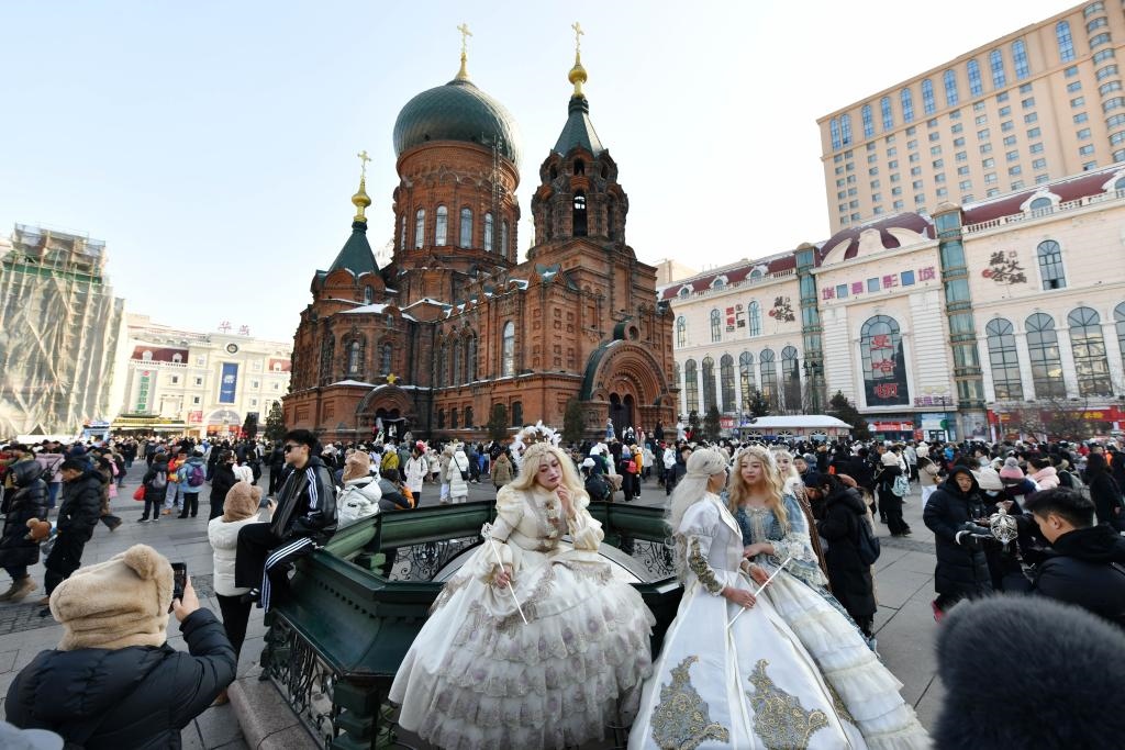 2月12日,旅拍游客在哈爾濱建筑藝術廣場身著盛裝拍照。(新華社記者王建威攝)