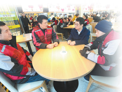近日,全國人大代表、浙江晨泰科技股份有限公司副總工程師胡東方(右二)深入快遞員、外賣騎手群體,了解他們的所想所需。