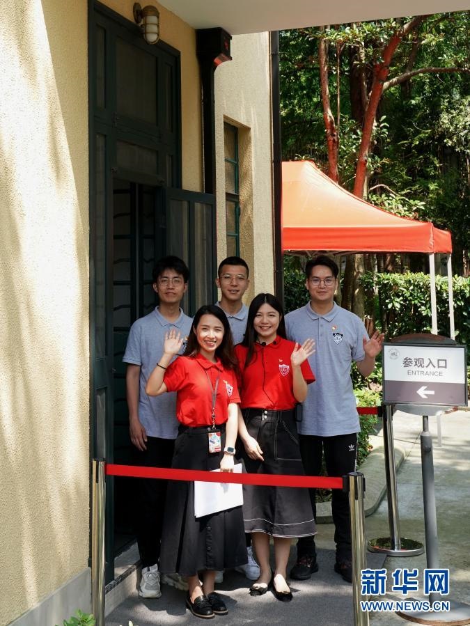 在復(fù)旦大學(xué)《共產(chǎn)黨宣言》展示館,一支名為“星火”的黨員志愿服務(wù)隊(duì)部分隊(duì)員在館前合影(2020年6月30日攝)。新華社記者 劉穎 攝